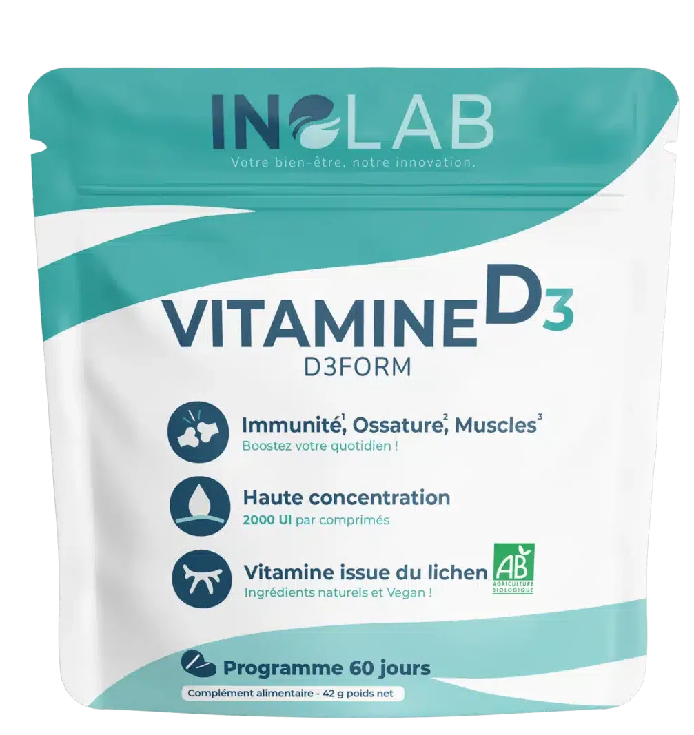 D3-FORM apporte une dose journalière de 2000 UI de vitamine D par comprimé, indispensable au bon fonctionnement du corps humain. La vitamine D contribue : à l’absorption et à l’utilisation normales du calcium et du phosphore, au maintien d’une ossature, d’une dentition et d’une fonction musculaire, normales + au fonctionnement normal du système immunitaire.